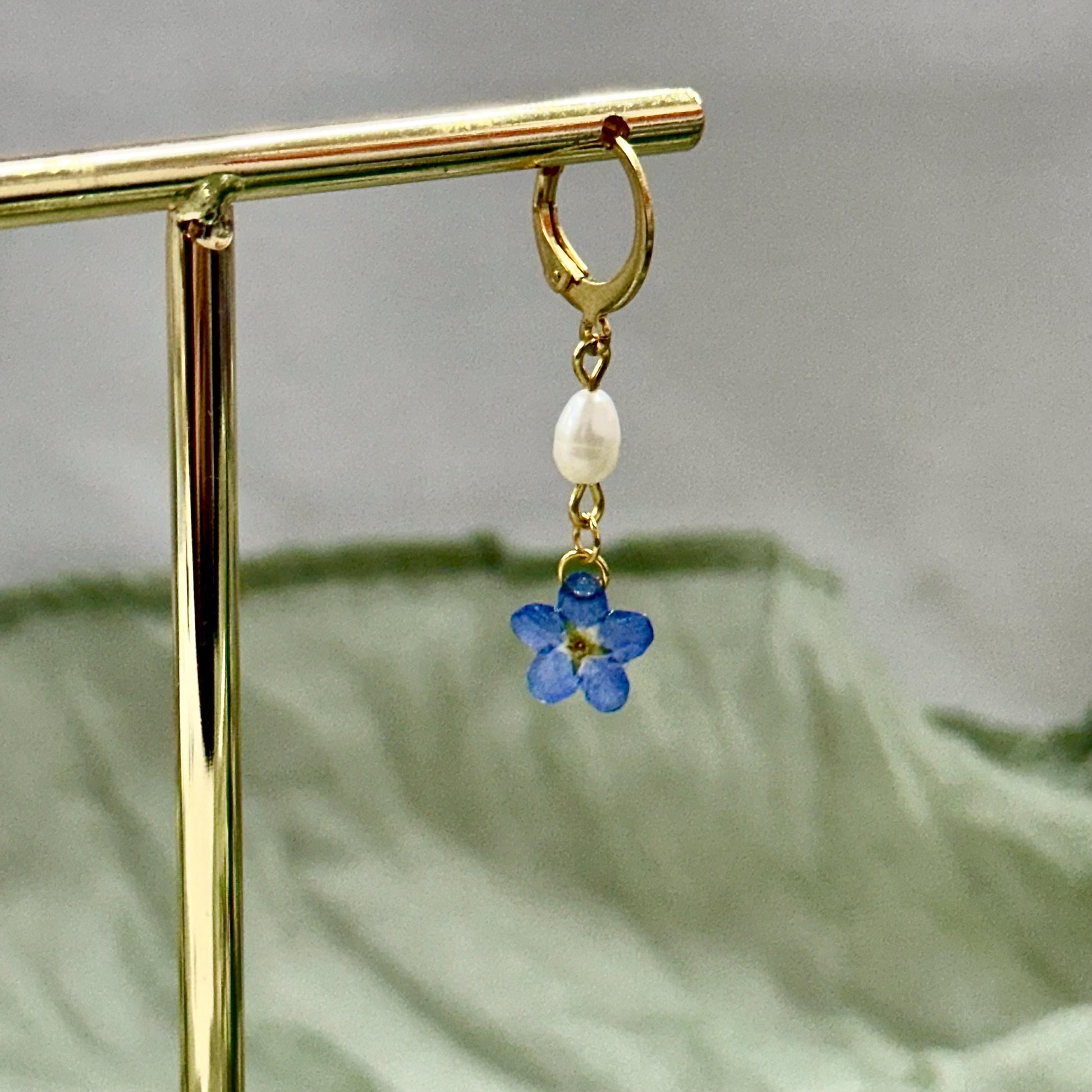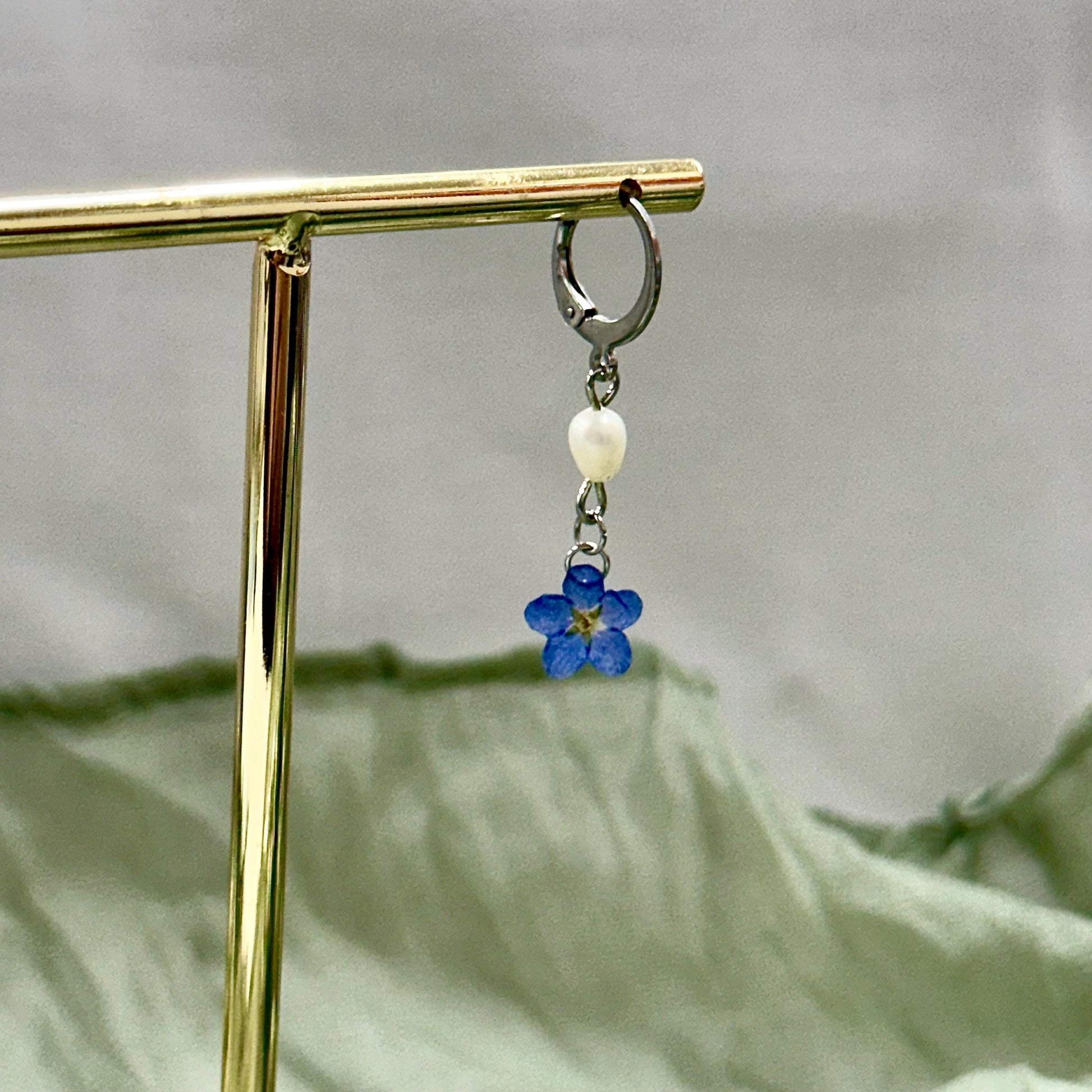 Bring a touch of nature’s elegance to your jewelry collection with these handmade earrings featuring real pressed blue forget me not flowers and freshwater pearls. Each delicate flower is preserved in resin to maintain its vibrant color and natural beauty, paired with lustrous pearls and gold-plated findings for a timeless and feminine look.