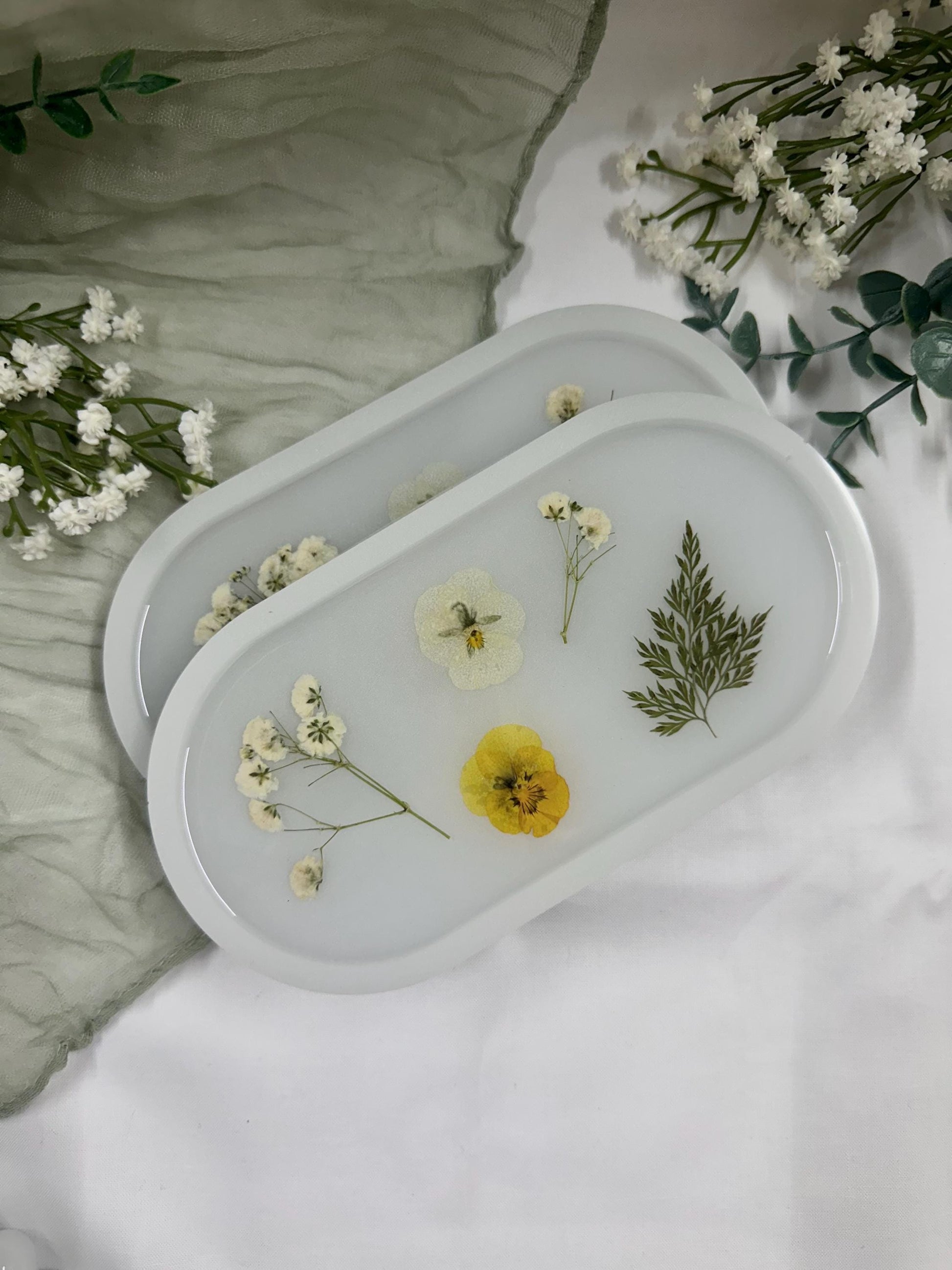 Pressed Flower Resin Tray – Oval Jewelry Dish with Real Flowers, Handmade Trinket Tray, Botanical Decor, Vanity Organizer, Gift for Her