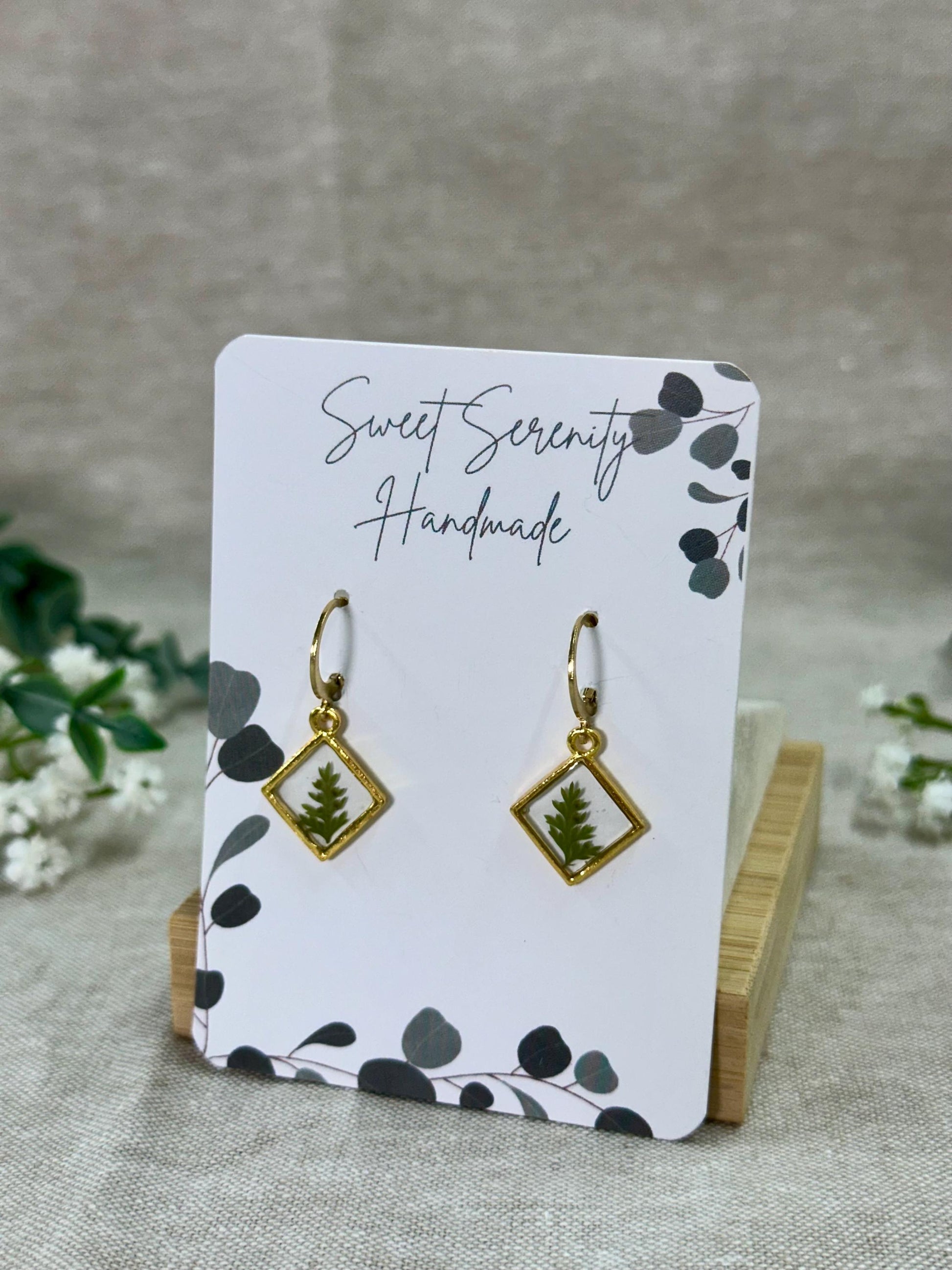 Bring the beauty of nature everywhere you go with these handmade gold fern earrings. Each earring features a tiny real pressed fern leaf preserved in crystal-clear resin, framed in a dainty gold diamond shape. Lightweight and elegant, they add a natural, earthy touch to any outfit.